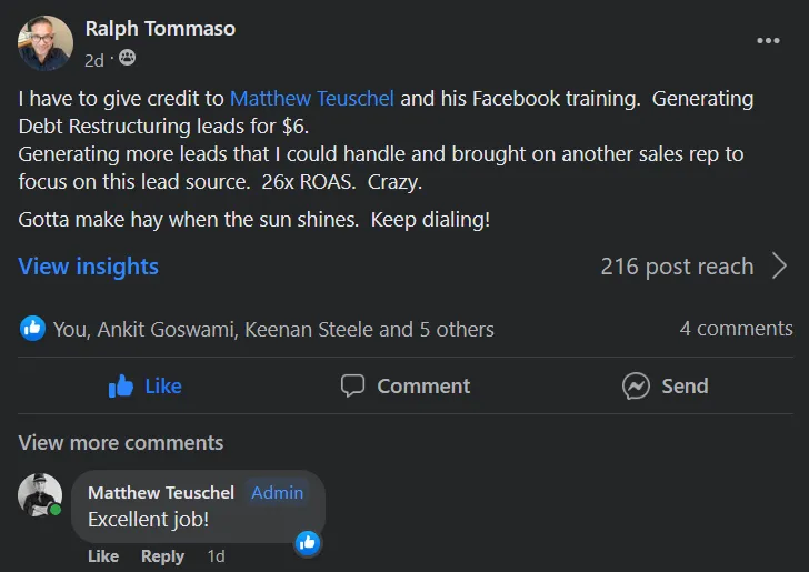 Get stuck on something or need a campaign reviewed? Join the Leads For Locals Facebook group to get all of your questions answered and consider upgrading to our paid community for live campaign assistance.